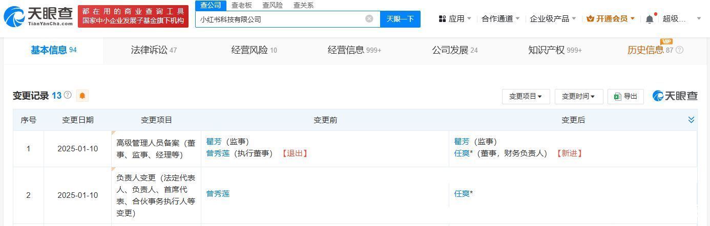 天眼查App显示,近日,小红书科技有限公司发生工商变更,曾秀莲卸任法定代表人、执行董事,新增任爽担任法定代表人、董事、财务负责人。