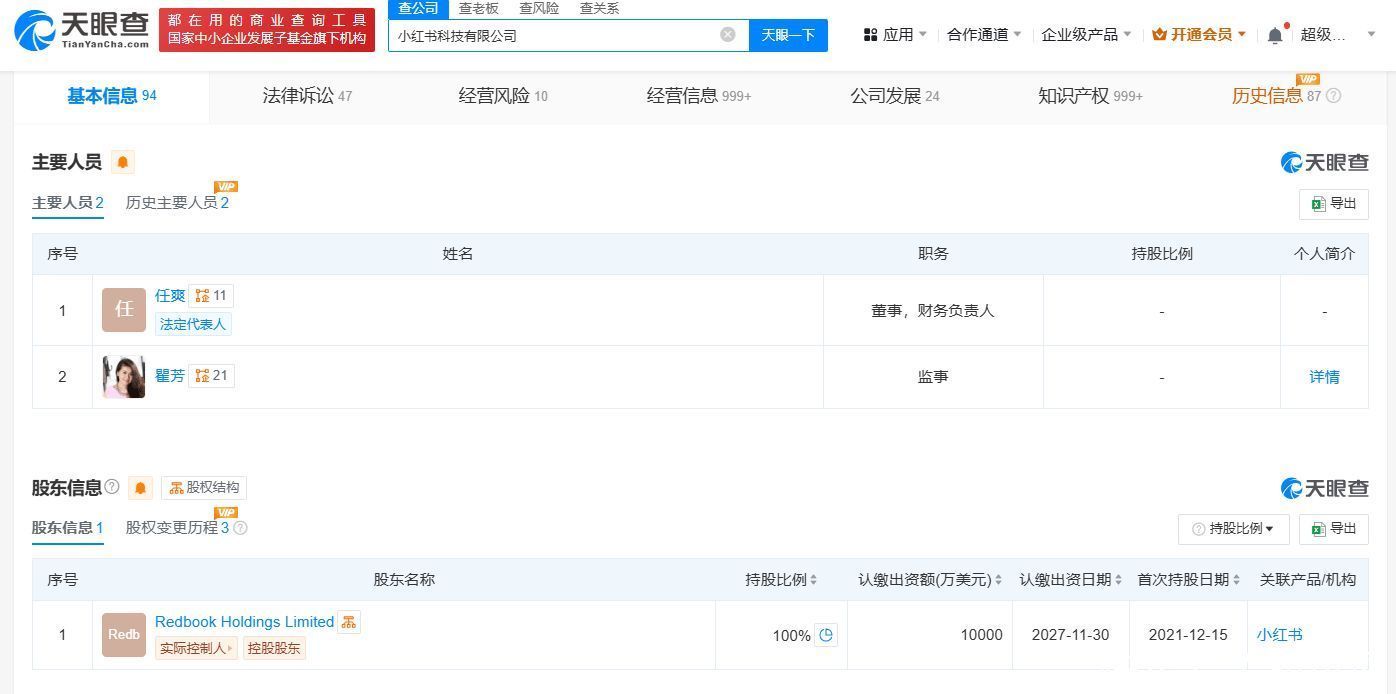 曾秀莲卸任小红书科技公司执行董事